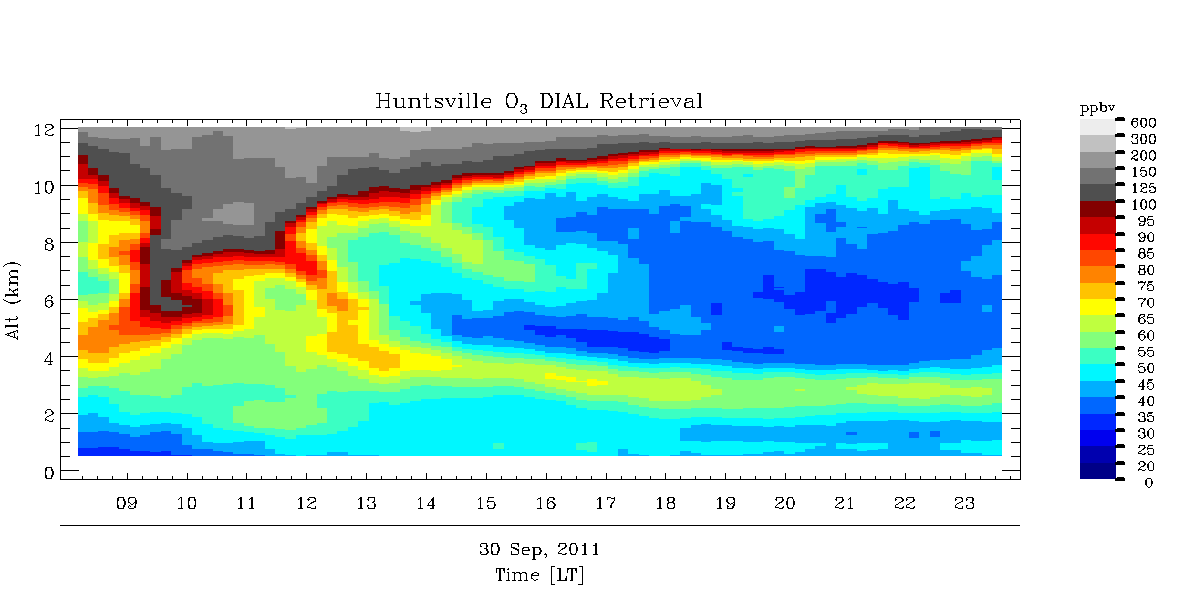 Stratosphere-troposphere exchange (STE) detected by lidar today, confirmed by the GOME total ozone and GOES band-10 (7.5um) water vapor channel (1100 and 1900 UTC).