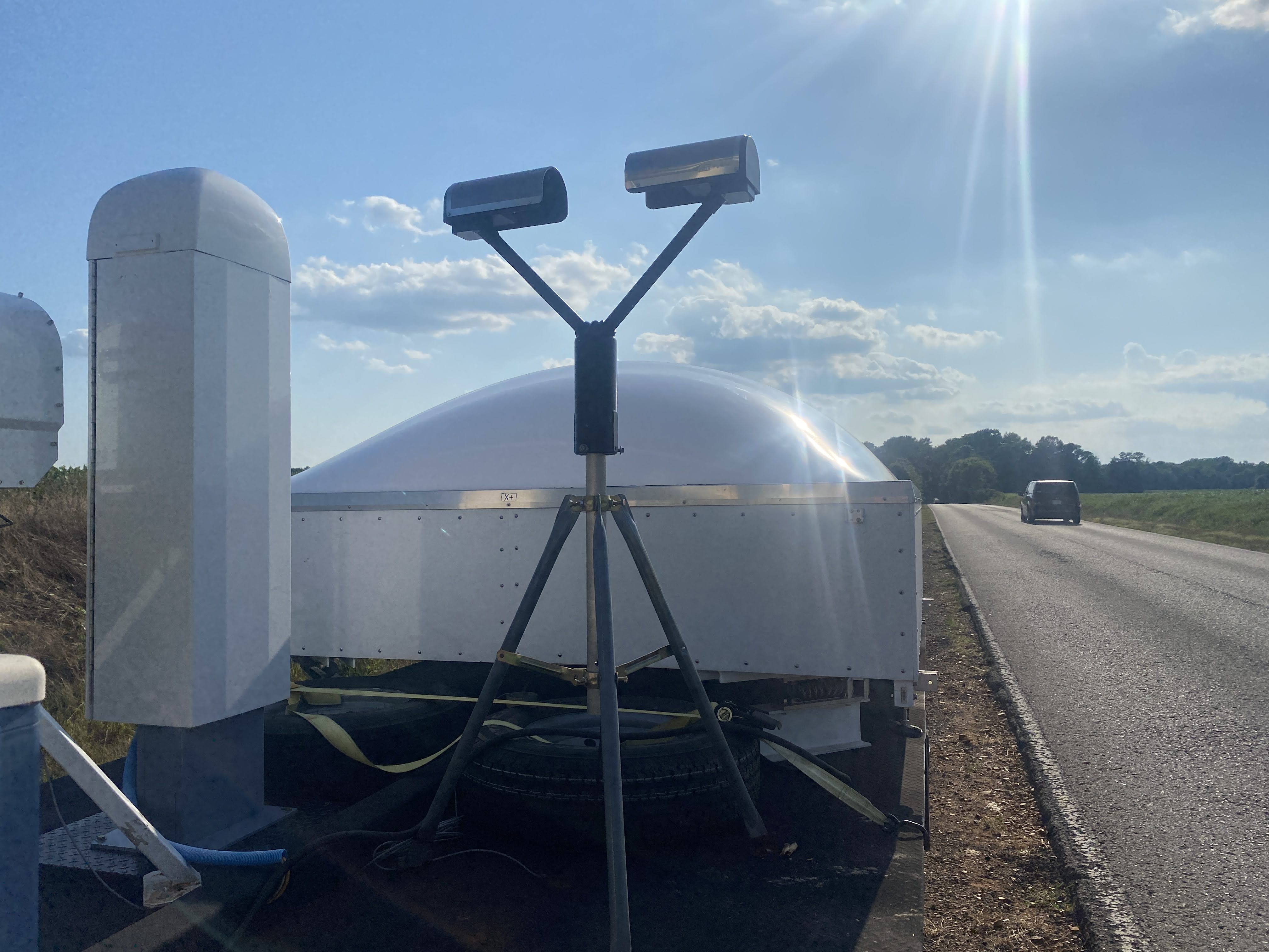 Mounted to both the MIPS and RaDAPS facilities, MAPNet uses the OTT Hydromet Parsivel disdrometer. Using laser technology, the parsivel disdrometer detects falling precipitation and classifies them into 32 diameter and velocity classes. The disdrometer also provides visibility, reflectivity estimates, and rain total and intensity measurements. The disdrometers can also be removed from the platforms to provide measurements in remote or independent locations. Tipping bucket rain gauges are also co-located with the disdrometers on both platforms for ground-truth comparisons. The disdrometer mounted on MIPS. |